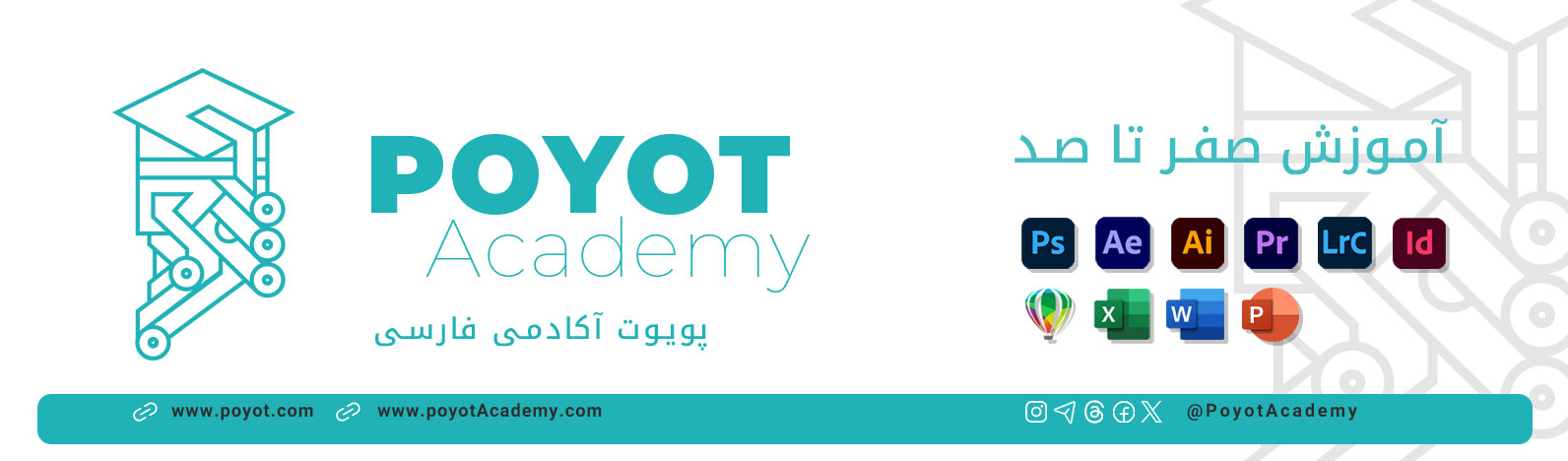 در کنار آموزش رایگان فتوشاپ، ایلوستریتور، ایندیزاین، کورل دراو، لایت روم، پریمیر، افتر افکتس، مایکروسافت اکسل، مایکروسافت ورد و پاور پوینت، کلی پلی لیست جذاب دیگه هم در کانال یوتیوب Poyot Academy هست که میتونید ازشون استفاده کنید.